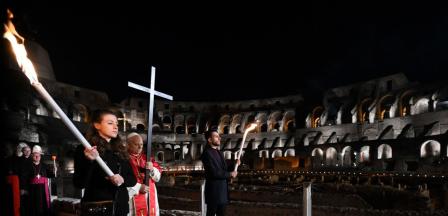 León XIV retoma tradición y carga la cruz en el viacrucis del Coliseo Romano