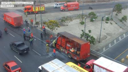 Un camión que transportaba bebidas gaseosas se incendió en la vía Perimetral, en el norte de Guayaquil, la mañana de este jueves 6 de noviembre de 2025.