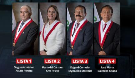 Los cuatro candidatos a la Presidencia del Congreso de Peru, el ganador se convertirá en el jefe de Estado interino, el 18 de febrero de 2026.