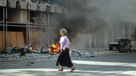Una mujer corre ante un edificio bombardeado en Sarajevo