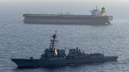 El destructor de misiles guiados USS Rafael Peralta (DDG 115) hace cumplir el bloqueo estadounidense de los puertos iraníes contra el M/T Stream después de que intentara navegar hacia un puerto iraní.