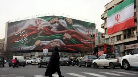 Una mujer iraní cruza una calle cerca de un cartel que dice "Irán es nuestra patria" en la Plaza Enqelab en Teherán, Irán, el 13 de enero de 2026