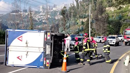 Personal del Cuerpo de Bomberos de Quito acudió al lugar. No se registraron personas fallecidas ni heridas. Según las primeras investigaciones, el camión perdió el carril de circulación y se volcó.