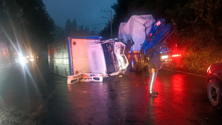 El primer siniestro se reportó a las 05:30. El automotor pesado se impactó contra un árbol y un poste en El Troje, en el puente de Catacuango. Por el fuerte choque perdió estabilidad y se volcó.