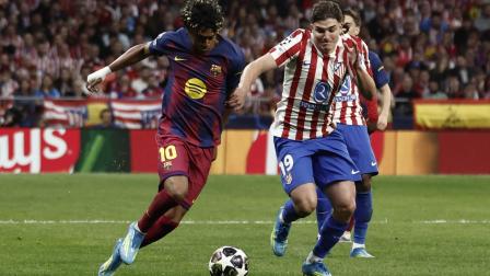 MADRID, 14/04/2026.- El delantero del Barcelona Lamine Yamal (i) trata de escapar de Julián Álvarez, del Atlético, durante el partido de vuelta de cuartos de final de Liga de Campeones