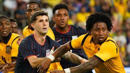 Angelo Preciado disputa el esférico con el estadounidense Christian Pulisic. Atrás Willian Pacho.