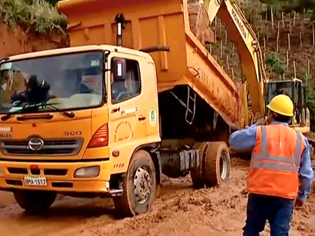 Trabajadores tratan de despejar la vía con el uso de maquinarias.