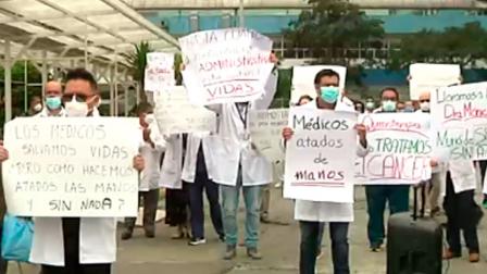 Personal sanitario del Hospital Carlos Andrade Marín protestó la mañana de este lunes en los exteriores de esta casa de salud en demanda de la dotación de equipos de medicinas e insumos para todas las áreas del hospital.