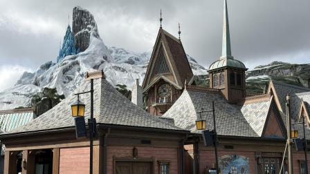 Vista de los tejados y decorados del reino de Arendelle, del mundo de Frozen en el 'Disney Adventure World'.