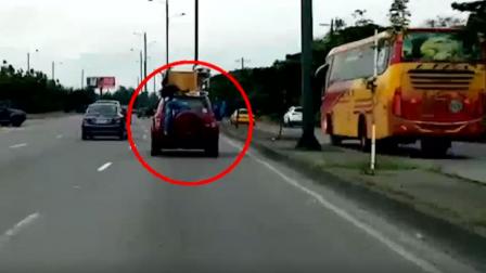 Una persona iba parada en la parte trasera de un vehículo sosteniendo un mueble en la autopista Narcisa de Jesús.